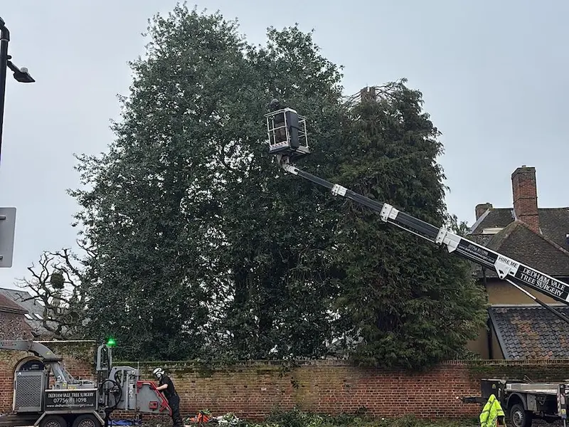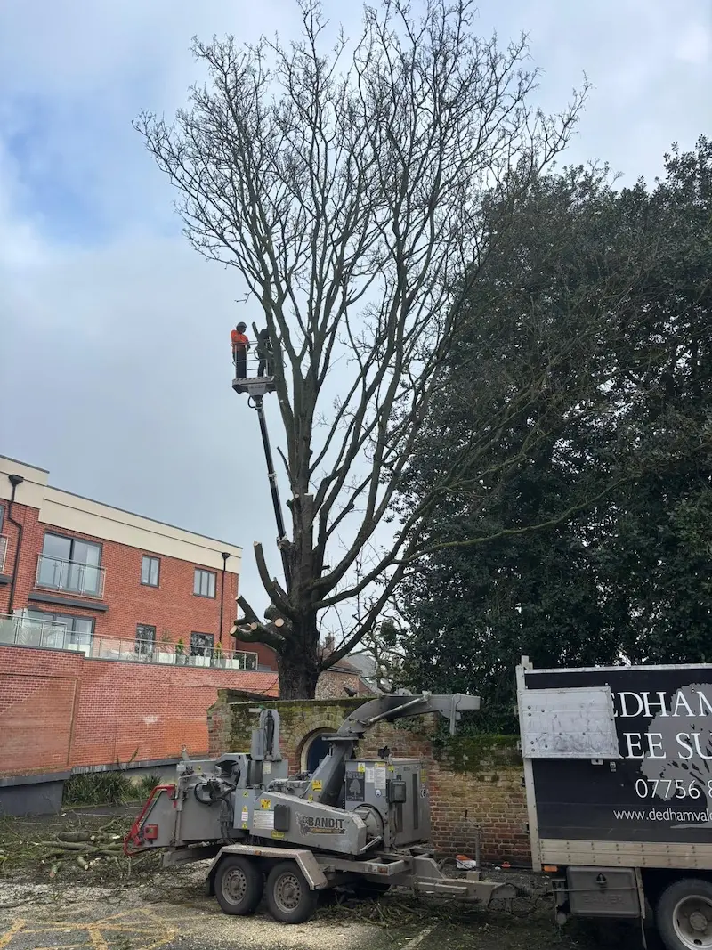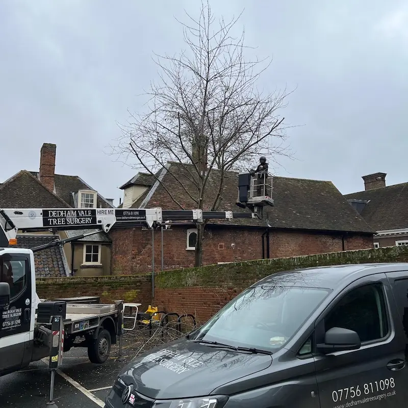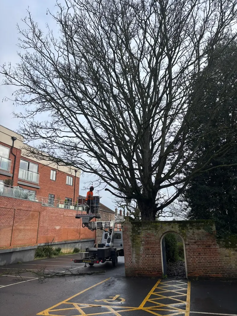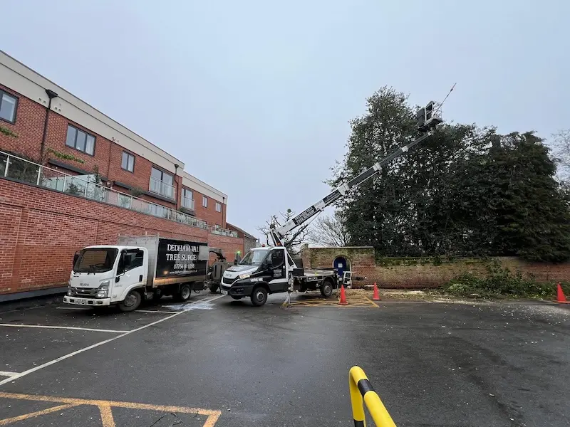 At Dedham Vale Tree Surgery, we are proud to support organisations that care for some of the UK’s most valued landscapes. Recently we carried out a range of tree management works for the National Trust at a site in Bury St Edmunds, focusing on improving safety within a car park area while maintaining the health and structure of the surrounding trees. The project involved crown reductions, tree removals, and management of trees affected by early signs of disease, all while working around protected trees and listed buildings.